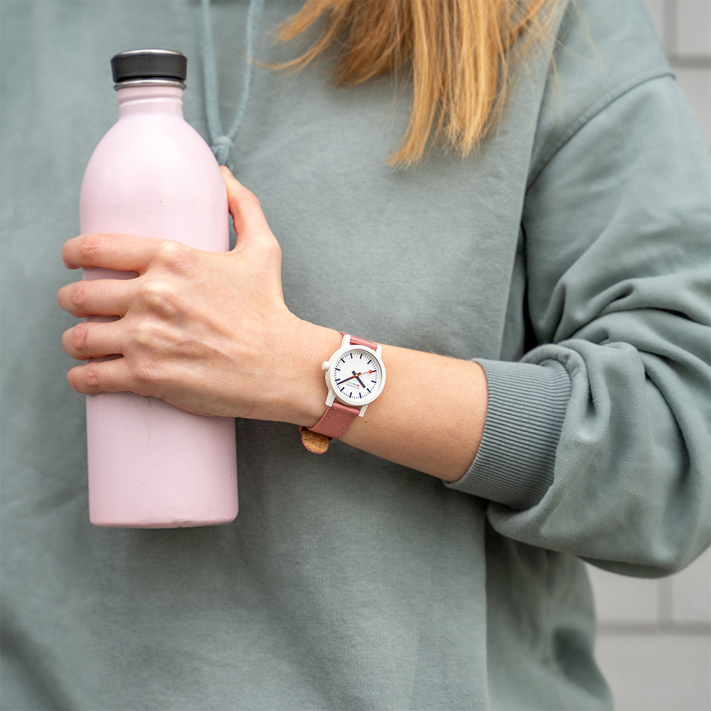 Mondaine瑞士國鐵的Classic平面經典系列腕錶,是源自於1986年品牌第一款以瑞士鐵路鐘面設計的腕錶,輕薄、扁平化、極簡的外觀造型,成為品牌數十年來不變的暢銷經典作品。 本系列錶款是中性的36 mm直徑尺寸,白色面盤搭配銀色髮絲紋不鏽鋼錶殼以及同色的指針刻度,以刻意淡化的面盤設計手法,讓熱情迷人的紅色棒棒糖秒針在跳動顯得更加閃耀,營造出更大的對比。 推出SBB Classic系列新品,完全採用生命之母-地球的顏色。每種顏色都可以追溯到自然,並暗示其整體之美。瑞士國鐵透過這個主題作為出發點,發想出以下幾種顏色。