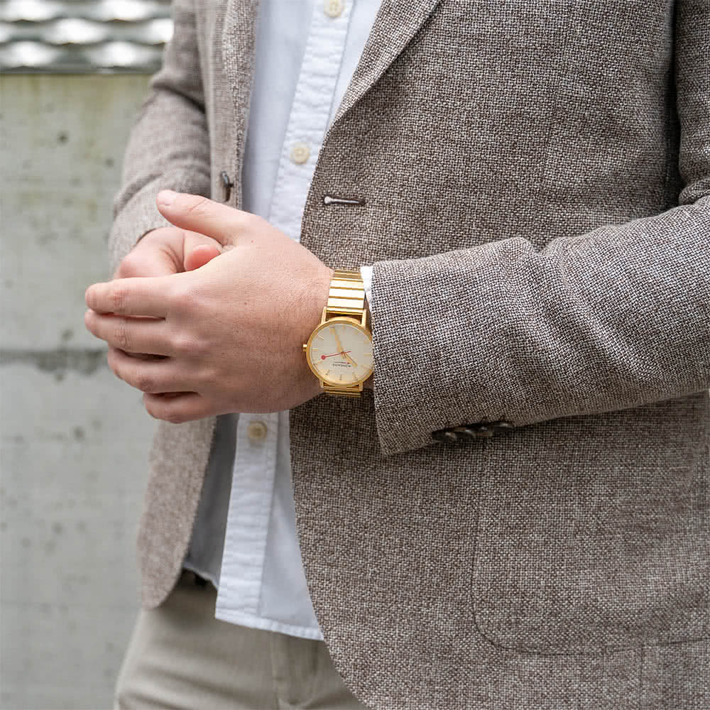 商品影片 MONDAINE 瑞士國鐵 evo2 Gold時光走廊腕錶 - 40mm 栗棕金/霧黑金 MARRON BROWN 栗棕金 質樸、帥氣且柔軟的栗棕色錶帶與銀色髮絲紋金屬錶盤,透過淡金色的錶殼完美串連。在光影變化下,亮面拋光處理的金色指針刻度與外殼互相輝映,躍然於上的紅色圓秒針,在舉手投足間顯得如此閃耀動人。 眾多潮流分析師一致認為,棕色色調具有中性、舒適、柔軟的性質,能讓我們感到安定,並聯想到有溫度的觸覺感,可望在後疫情時代大受關注。如此令人愉悅和放鬆的設計,使得本款evo2