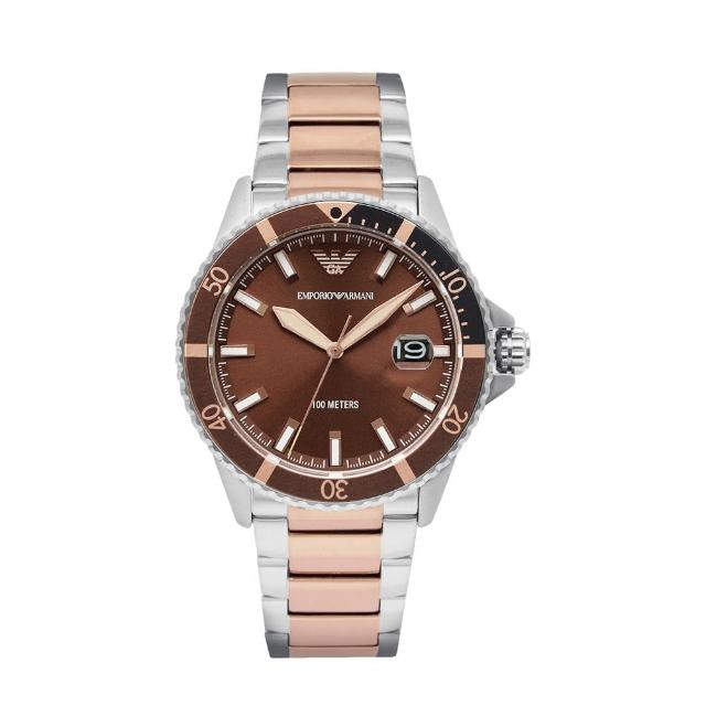 【EMPORIO ARMANI】原廠平行輸入 水鬼系列 棕色面玫瑰金指針 銀殼 不鏽鋼錶帶(AR11340)