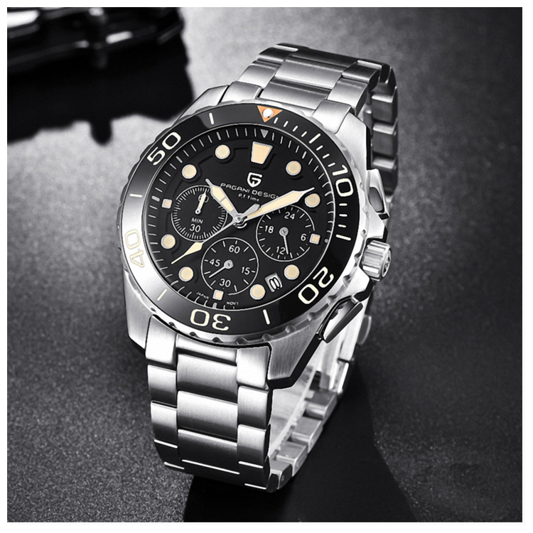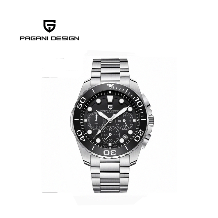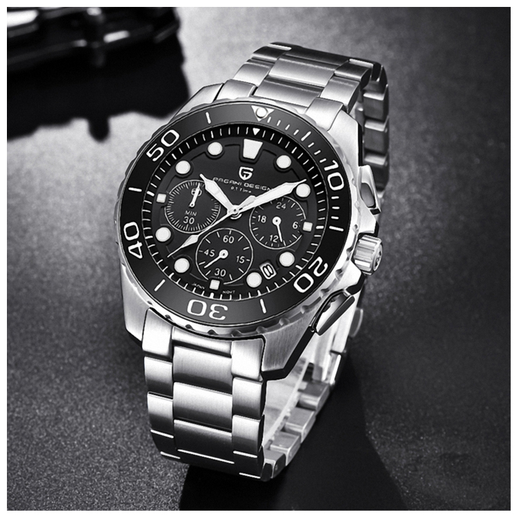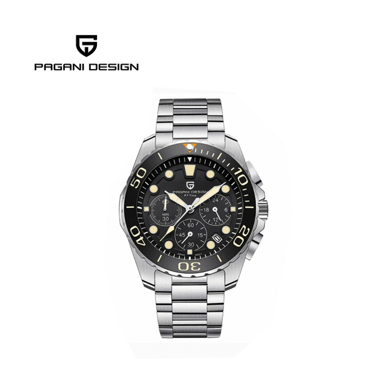 PAGANI DESIGN 時尚三眼石英水鬼不鏽鋼錶 PD-2773-銀黑、